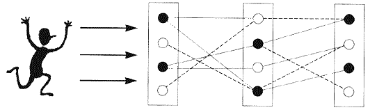 ¿¬°áÁÖÀÇ¿¡ ÀÇÇϸé, ÀÎÁöÀÇ ±¸Á¶´Â ´ÜÀ§µéÀÌ ¹«¸®Áö¾î¼ ±¸¼ºµÇ´Â ÃþµéÀÌ ¸î °³·Î °áÇյǾî Çü¼ºµÈ´Ù. ÀÚ±ØÀº ÇÏÀ§Ãþ¿¡¼ »óÀ§ÃþÀ¸·Î ÆÛÁ®³ª°£°¡. ½Ã°¢ÀÇ °æ¿ì¿¡ ÃÖÇÏÀ§Ãþ (ÀÔ·ÂÃþ) Àº ¸Á¸·¿¡ ÇØ´çÇÑ´Ù. ¿ÜºÎ·ÎºÎÅÍÀÇ Àڱؿ¡ µû¶ó ¸Á¸·¿¡ ÀڱصǴ Çö»óÀÌ ´Ù¸£µíÀÌ, ¿ÜºÎÀÇ Àڱؿ¡ µû¶ó Ȱ¼ºÈµÇ´Â ÀÔ·ÂÃþ ´ÜÀ§µéÀÇ Á¶ÇÕÀº ´Ù¸£°Ô ³ªÅ¸³´Ù (¾ÕÀÇ ±×¸²¿¡¼ ÀÔ·ÂÃþÀÇ °Ë°Ô ³ªÅ¸³ ´ÜÀ§µéÀÇ Á¶ÇÕ). À̵é Ȱ¼ºÈµÈ ´ÜÀ§µéÀ» ¹Ù·Î »óÀ§ÃþÀÇ ´ÜÀ§µéÀ» Ȱ¼ºÈÇϰí, ÀÌ °úÁ¤Àº ÃÖ»óÀ§ÃþÀÎ Ãâ·ÂÃþ¿¡ ´Ù´Ù¸§À¸·Î½á ³¡³´Ù. Ãâ·ÂÃþ¿¡¼ Ȱ¼ºÈµÈ ´ÜÀ§µéÀÇ Æ¯Á¤ÇÑ Á¶ÇÕ (¾ÕÀÇ ±×¸²¿¡¼ Ãâ·ÂÃþÀÇ °Ë°Ô ³ªÅ¸³ ´ÜÀ§µéÀÇ Á¶ÇÕ) ÀÌ Æ¯Á¤ÇÑ ½Ã°¢ÆÇ´Ü°ú ´ëÀÀÇÑ´Ù. ¾ÕÀÇ ±×¸²¿¡¼ ½Ç¼±Àº ±àÁ¤Àû ¿¬°á (Ȱ¼ºÈ excitation) À» ³ªÅ¸³»¸ç, Á¡¼±Àº ºÎÁ¤Àû ¿¬°á (±ÝÁö inhibition) À» ³ªÅ¸³½´Ù. ±×¸®°í ¾Õ ±×¸²¿¡¼´Â ³ªÅ¸³ªÁö ¾Ê¾ÒÁö¸¸. °¢ Á¡¼±°ú ½Ç¼±¿¡¼ ³ªÅ¸³ ¿¬°áÀÇ Á¤µµ°¡ ´Ù¸¦ ¼ö ÀÖ´Ù.