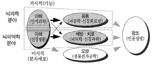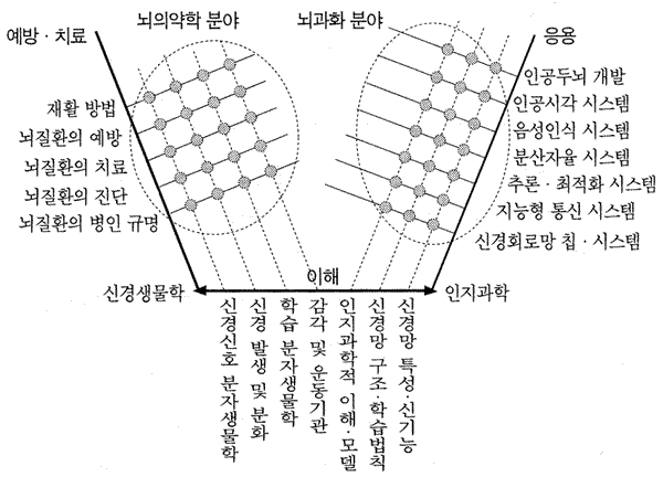 ±×¸² 1 Àº Çѱ¹ÀÇ ³ú¿¬±¸ ÁÖ¿ä ¿¬±¸ ºÐ¾ß ¹× »óÈ£ ¿¬°ü¼ºÀ» º¸ÀÎ °ÍÀ¸·Î, ³ú¿¬±¸ÀÇ 5 °³ ¿¬±¸ ¸ñÇ¥ Áß ¾ÆÁ÷ ¿¬±¸ ¹æÇâÀÌ ºÒÅõ¸íÇÏ°í ºñ±³Àû Àå±â°£À» ¿äÇÏ´Â »ý¹°ÇÐÀû ¸ð¹æ°ú Àΰø»ý¸íÀÇ Ã¢Á¶¸¦ ÀÏ´Ü Á¦¿ÜÇϰí, ³ú±â´ÉÀÇ ÀÌÇØ. ÀÀ¿ë ¹× Ä¡·á¿¡ ÃÊÁ¡À» ¸ÂÃß°í ÀÖ´Ù. ¿¬±¸ È¿À²À» À§ÇÑ ¸ñÇ¥ ÁöÇ⼺À» À§ÇØ 'Àΰ£±â´É ½Ã½ºÅÛ' ±¸ÇöÀ» À§ÇÑ °øÇÐÀû ÀÀ¿ë ¹× '³úÁúȯÀÇ ±Øº¹' À» À§ÇÑ ÀÇÇÐÀû ¿¹¹æ ¹× Ä¡·áÀÇ 2 ´ë ¿¬±¸ ¸ñÇ¥¸¦ Á¦½ÃÇϰí, °¢°¢ °ü·ÃµÇ´Â ±âÃÊ ÀÌÇØ ºÐ¾ß¸¦ Æ÷ÇÔÇÏ°Ô Çϰí ÀÖ´Ù. Áï, ½Å°æ»ý¹°Çаú ÀÎÁö°úÇÐÀ¸·Î ´ëº°µÇ´Â ³ú±â´ÉÀÇ ÀÌÇØ ºÐ¾ß°¡ º¸´Ù °øÇÐÀû ÀÀ¿ë ¹× ÀÇÇÐÀû Ä¡·á¿Í ¹ÐÁ¢ÇÏ°Ô °ü·ÃµÇ¾î, ¿¬±¸ÀÇ Àϰü¼ºÀº ¹°·Ð »óÈ£ »ó½ÂÈ¿°ú¸¦ °ÅµÑ ¼ö ÀÖ´Â ¿¬±¸ üÁ¦ÀÌ´Ù. °úÇбâ¼úóÀÇ 'Braintech' 21 ' ±âº» °èȹ¿¡¼´Â, ±×¸² 2 ¿¡¼¿Í °°ÀÌ ³ú±â´É ÀÌÇØÀÇ °ü·Ã ºÐ¾ß¿Í °øÇÐÀû ÀÀ¿ëÀÌ' ³ú°úÇÐ ¿¬±¸' ¶ó´Â °úÁ¦¸¦ Çü¼ºÇϰí, ¿ª½Ã ³ú±â´É ÀÌÇØÀÇ °ü·Ã ºÐ¾ß¿Í ³úÁúȯ Ä¡·á°¡ '³úÀǾàÇÐ ¿¬±¸' ¶ó´Â °úÁ¦¸¦ Çü¼ºÇÑ´Ù. È¥µ·À» ÁÙ ¼ö ÀÖ´Â °úÁ¦¸íÀ̳ª, ¿¬±¸ÀÇ ¸ñÇ¥ ¹× ³»¿ëÀº ¸íÈ®ÇÏ´Ù.