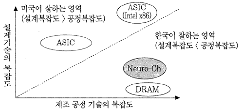 ±×¸² 3 ¹ÝµµÃ¼ ÁýÀûȸ·Î ±â¼ú¿¡¼ Çѱ¹ÀÌ À¯¸®ÇÑ ºÐ¾ß. ¹ÝµµÃ¼ ¸Þ¸ð¸® DRAM °ú ½Å°æÈ¸·Î¸Á Ĩ Neuro-chip Àº ´Ü¼øÇÑ ¼¿À» ´ë±Ô¸ð·Î ¹Ýº¹Çؼ Á¦Á¶ÇϹǷÎ, ¼³°è°¡ »ó´ëÀûÀ¸·Î ¿ëÀÌÇÏ¿© Çѱ¹ÀÌ À¯¸®ÇÑ ¿µ¿ªÀÌ´Ù.