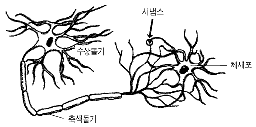 ±×¸² 1 Àº ½Å°æ¼¼ÃÊÀÇ ÀϹÝÀûÀÎ ±×¸²À¸·Î¼ ü¼¼Æ÷ (soma), ¼ö»óµ¹±â (dendrite) ¹× Ãà»öµ¹±â (axon) ÀÇ ¼¼°¡Áö·Î ±¸¼ºµÈ´Ù. ü¼¼Æ÷¿¡´Â ÀÌ¿ÂÀÇ ³óµµ·Î ½Å°æÀüÀ§°¡ Çü¼ºµÇ°í, ÀÌ ½Å°æÀüÀ§´Â µµÆÄ°ü (transmission line) ÀÇ ±â´ÉÀ» ÇÏ´Â Ãà»öµ¹±â¸¦ µû¶ó ÀüÆÄµÈ´Ù. Ãà»öµ¹±âÀÇ ³¡¿¡¼´Â ½Å°æÀü´Þ¹°Áú (neurotransmitter) ÀÌ ºÐºñµÇ¾î ½Ã³À½º¸¦ °ÅÃÄ ¿¬°áµÈ ´Ù¸¥ ½Å°æ¼¼Æ÷ÀÇ ¼ö»óµ¹±â·Î Àü´ÞµÇ´Ù. À̶§ ½Ã³À½ºÀÇ ¿¬°á¼¼±â (synaptic weight)¿¡ µû¶ó ½ÅÈ£Àü´ÞÀÇ Á¤µµ°¡ ¹Ù²ï´Ù.