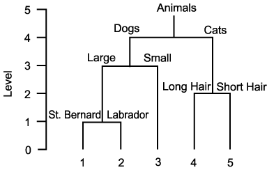 hierarchy ´Â ´ÙÀ½ ±×¸²°ú °°ÀÌ tree ±¸Á¶·Î Ç¥ÇöµÉ ¼ö ÀÖ´Ù. µ¿¹° º´¿ø¿¡¼ ȯÀÚµéÀº Å©°Ô °³¿Í °í¾çÀÌ·Î ±¸¼ºµÇ¸ç °¢ÀÚ subgroup À¸·Î ³ª´²Áö¸ç ±×°ÍÀº ´Ù½Ã subgroup À¸·Î ³ª´²Áø´Ù. °¢°³ÀÇ µ¿¹°Àº 1 ~ 5 ·Î ±¸ºÐµÇ¸ç °¡Àå ¾Æ·¡¿¡ À§Ä¡ÇÑ´Ù. hierarchical clustering Àº data¸¦ ¸¹Àº ÀÛÀº ±×·ìÀ¸·Î ±¸¼ºµÇ´Â Å« ±×·ìÀ» ±¸¼ºÇÏ´Â °úÁ¤À» ÀǹÌÇÑ´Ù. ÈçÈ÷ tree ³ª dendrogram À¸·Î ±×·Á¼ Ç¥ÇöÇÏ¸ç °¡Àå ¹Ì¼¼ÇÑ ±×·ìÀº °¡Àå ¾Æ·¡¿¡ À§Ä¡ÇÏ¸ç °¢ sample Àº ÇϳªÀÇ cluster¸¦ Çü¼ºÇÑ´Ù. °¡Àå Å« ±×·ìÀÌ Á¦ÀÏ À§¿¡ À§Ä¡ÇÏ¸ç °¢ sample µéÀº ÇϳªÀÇ cluster ±×·ì¿¡ ¼ÓÇÑ´Ù.