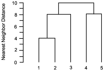 ¾Ë°í¸®ÁòÀº °¢ÀÚ ÇϳªÀÇ sampleÀ» °¡Áö´Â 5 °³ÀÇ cluster ·Î ½ÃÀÛÇÑ´Ù. ±×¸®°í ³ª¼ 2 °³ÀÇ °¡Àå °¡±î¿î cluster °¡ º´ÇյȴÙ. À§ÀÇ Ç¥¿¡¼ °¡Àå ÀÛÀº ¼ö´Â 4 À̰í sample 1 °ú 2 »çÀÌÀÇ °Å¸®ÀÌ´Ù. µû¶ó¼ cluster {1} °ú {2} °¡ º´ÇյȴÙ. À̶§´Â ´ÙÀ½ÀÇ 4 °³ÀÇ cluster °¡ µÈ´Ù.