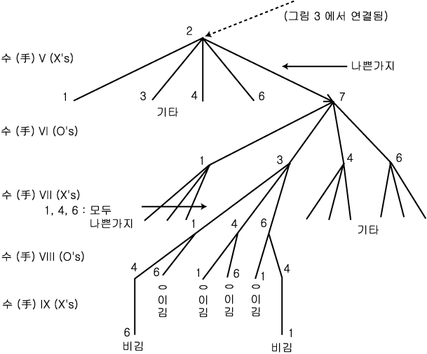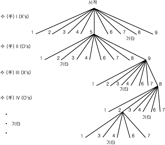 ´Ü¼øÇÑ °æ¿ìµé¿¡¼ ½ÃÀÛÇØ º¸ÀÚ. ¼¼¸ñ ³õ±â °ÔÀÓ È¤Àº ¡Û× °ÔÀÓ (±×¸² 2) À» »ý°¢ÇØ º¸ÀÚ. ±×¸®°í ÄÄÇ»ÅͰ¡ À̱â°Å³ª ȤÀº Àû¾îµµ ´Ù¸¥ ¼±¼ö¿Í ºñ±æ °æ¿ì¸¦ ÃÖ´ëÈÇϱâ À§ÇØ ÄÄÇ»ÅͰ¡ ½á¸ÔÀ¸¸®¶ó ¿©°ÜÁö´Â °úÁ¤µéÀ» »ý°¢ÇØ º¸ÀÚ. ÄÄÇ»ÅͰ¡ ¸ÕÀú × ·Î ½ÃÀÛÇÑ´Ù°í Çϸé, ±×°ÍÀº µÑ ¼ö ÀÖ´Â 9 °¡Áö °¡´ÉÇÑ ¼ö¸¦ °®´Â´Ù. ÀÌµé °¢°¢¿¡ ´ëÇØ ¡Û ¸¦ ¼±ÅÃÇÑ ¼±¼ö´Â 8 °¡Áö °¡´ÉÇÑ ¸Â¼´Â ¼ö¸¦ °¡Áø´Ù. ±×¸®°í ÀÌµé °¢°¢¿¡ ´ëÇØ¼ ÄÄÇ»ÅÍ´Â 7 °¡Áö °¡´ÉÇÑ ¹ÝÀÀÀ» ÇÒ ¼ö ÀÖ´Ù. ÀÌ·¸°Ô °è¼Ó ÁøÇàµÈ´Ù. °£´ÜÇÑ °è»êÀ» ÇØº¸¸é, 9 × 8 × 7 × ¡¦ × 2 ( = 9! = 362,880) °¡ÁöÀÇ ºóÄÀ» ä¿ö °¡´Â ´Ù¸¥ ¹æ½ÄµéÀÌ Á¸ÀçÇÑ´Ù. (ºó ÄÀÌ ´Ù ä¿öÁö±â Àü¿¡µµ ´ëºÎºÐÀÇ °ÔÀÓÀº × ³ª ¡Û ¼¼ °³°¡ ÀÏ·Ä·Î ´Ã¾î¼± °æ¿ì¿¡´Â ³¡³ª±â ¶§¹®¿¡ ´Ù¼Ò ÀÌ ¼ýÀÚº¸´Ù´Â ÀûÀº ¼öÀÇ ¿Ï·áµÈ °ÔÀÓµéÀÌ Á¸ÀçÇÑ´Ù.) ¿ì¸®´Â ÀÌ·± °¡´É¼ºµéÀ» °ÔÀÓ ¼öÇüµµ (±×¸² 3) ·Î ³ªÅ¸³¾ ¼ö ÀÖ´Ù.