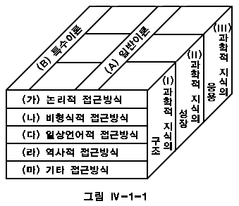 ÀÌ ºÐ·ùÇ¥´Â ¹°·Ð »ç½Ç°úÇÐÀÇ Áö½ÄÀ» ¸ðµ¨·Î ÇÑ °ÍÀÌÁö¸¸ ´Ù¸¥ Á¾·ùÀÇ °úÇÐ, ƯÈ÷ ±â¼ú°úÇÐÀ» ³íÇÏ´Â µ¥µµ µµ¿òÀÌ µÉ °ÍÀÌ´Ù. À§ÀÇ µµÇ¥´Â °úÇÐöÇÐÀÇ ¿¬±¸´ë»ó ¿µ¿ªÀ» °úÇÐÀû Áö½Ä¿¡ ÇÑÁ¤½Ã۰í (¥°) °úÇÐÀû Áö½ÄÀÇ ±¸Á¶, (¥±) °úÇÐÀû Áö½ÄÀÇ ¼ºÀå, (¥²) °úÇÐÀû Áö½ÄÀÇ ÀÀ¿ë, ÀÌ·¸°Ô ¼¼ °¡Áö·Î ±¸ºÐÇÏ¿© °ËÅäÇÑ´Ù. ´Ù¸¥ ÇÑÆí °úÇÐÀû Áö½ÄÀº °úÇÐ ÀϹݿ¡ °øÅëµÇ´Â Áö½ÄÀÌ·Ð (A) °ú, ¹°¸®Çз »ý¹°Çз ½É¸®ÇÐ µî Ư¼ö °³º° °úÇÐÀÇ Áö½Ä¿¡ °üÇÑ ÀÌ·Ð (B) À¸·Î ±¸ºÐµÉ ¼ö ÀÖ´Ù. ÀÌ ¾çÂÊÀ» °áºÎ½ÃŰ¸é °úÇÐöÇÐÀÇ ´ë»ó¿µ¿ªÀº Áö½Ä±¸Á¶ÀÇ ÀϹÝÀÌ·Ð (I A) °ú Ư¼öÀÌ·Ð (I B). Áö½Ä¼ºÀåÀÇ ÀϹÝÀÌ·Ð (II A), ¼ºÀåÀÇ Æ¯¼öÀÌ·Ð (II B), ±×¸®°í Áö½ÄÀÀ¿ëÀÇ ÀϹÝÀÌ·Ð (III A), Áö½ÄÀÀ¿ëÀÇ Æ¯¼öÀÌ·Ð (III B) À̶ó´Â 6°³ ºÎºÐÀ¸·Î ºÐ·ùµÈ´Ù. ±×¸®°í ÀÌµé ¿µ¿ª¿¡ °üÇÑ Á¢±Ù¹æ½ÄÀº ´Ù½Ã±Ý (°¡) ³í¸®Àû Á¢±Ù¹æ½Ä, (³ª) ºñÇü½ÄÀû Á¢±Ù¹æ½Ä, (´Ù) ÀÏ»ó¾ð¾îÀû Á¢±Ù¹æ½Ä, (¶ó) ¿ª»çÀû Á¢±Ù¹æ½Ä, (¸¶) ±× ¹ÛÀÇ Á¢±Ù¹æ½ÄÀ¸·Î ±¸ºÐÇÒ ¼ö ÀÖ´Ù. ÀÌ·± ºÐ·ù¿¡ ÀÇÇØ °úÇÐöÇÐÀ» °³³äÀûÀ¸·Î 30 °³ ¿µ¿ªÀ¸·Î ³ª´©°í ±×µé ¿µ¿ªÀÇ Æ¯¼º°ú »óÈ£¿¬°ü °ü°è¸¦ °ËÅäÇØ °¡¸é Á»´õ ºÐ¸íÇÏ°Ô ¼º°úÀÖ´Â ³íÀǸ¦ ÇØº¼ ¼ö ÀÖÀ¸¸®¶ó ±â´ëµÈ´Ù.