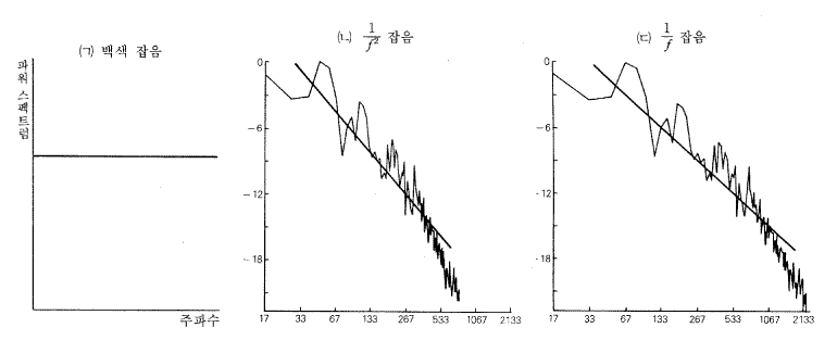 ¿¬¼ÓºÐÆ÷ ½ºÆåÆ®·³À¸·Î ¾Ë·ÁÁø °ÍÀ¸·Î´Â ¹é»öÀâÀ½, 1/f2 ÀâÀ½, 1/f ÀâÀ½ µîÀÌ ÀÖ´Ù. ÀÚ¿¬°è¿¡¼ º¼ ¼ö ÀÖ´Â ¸ðµç ÀâÀ½À̳ª ¿äµ¿À» ½ºÆåÆ®·³À¸·Î ºÐ¼®Çϸé, ÀÌ ¼¼ °¡Áö ÁßÀÇ Çϳª°¡ µÈ´Ù (±×¸² 56). 1/f ¿äµ¿ÀÇ f ´Â Á֯ļö (frequency) ÀÇ ¸Ó¸® ±ÛÀÚ·Î, ÆÄ¿ö ½ºÆåÆ®·³Àº f ¿¡ ¹Ýºñ·Ê, Áï 1/f ¿¡ ºñ·ÊÇÑ´Ù. ¿©±â¼´Â ÀÌ Áß¿¡¼ 1/f ¿äµ¿¿¡ ´ëÇØ¼¸¸ »ý°¢ÇØ º¸±â·Î ÇÑ´Ù.