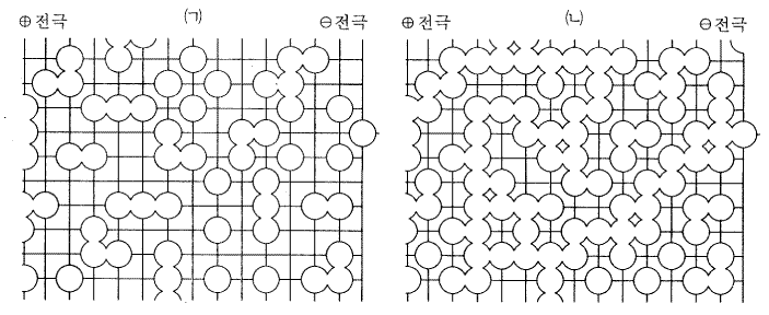 ±×¸² 57 (¤¤) À» ÀÚ¼¼È÷ °üÂûÇϸé, ¿øÀÌ ³¡¿¡¼ ³¡±îÁö ¿ÏÀüÈ÷ ¿¬°áµÇ¾î ÀÖ´Â °Í°ú ¿¬°áµÇ¾î ÀÖÁö ¾ÊÀº °ÍÀÌ ÀÖ´Ù. ÀÌ¿Í °°ÀÌ ÇÑ µ¢¾î¸®°¡ µÇ¾î ÀÖ´Â °¢°¢ÀÇ ¿øÀÇ µ¢¾î¸®¸¦ Ŭ·¯½ºÅÍ (cluster) ¶ó°í ÇÑ´Ù. ¿©±â¿¡¼ ¹®Á¦°¡ µÇ´Â °ÍÀº Àü±Ø¿¡¼ Àü±Ø±îÁö ¿ÏÀüÈ÷ ¿¬°áµÇ¾î ÀÖ´Â µ¢¾î¸®ÀÌ´Ù. ÀÓ°èÁ¡¿¡¼ óÀ½À¸·Î ±ÝÀÌ ¿ÏÀüÈ÷ ¿¬°áµÉ ¶§, ÀÌ Å¬·¯½ºÅ͸¦ Ÿ°í Àü·ù°¡ È帥´Ù. ÀÌ ¶§ÀÇ ±ÝÀÇ »êÆ÷ºñÀ²Àº 2 Â÷¿ø¿¡¼ 0.59 Á¤µµ µÇ´Â °ÍÀ¸·Î ¾Ë·ÁÁ® ÀÖ´Ù. À̺¸´Ù ´õ¿í´õ ±ÝÀÇ »êÆ÷ºñÀ²ÀÌ ³ô¾ÆÁö¸é ³¡¿¡¼ ³¡À¸·Î À̾îÁö´Â Ŭ·¯½ºÅÍ´Â ´õ¿í´õ Ä¿Áö°í, Àü±â ÀüµµÀ²Àº ¹ÝµµÃ¼ÀÇ Ç¥¸é ÀüºÎ¸¦ ±ÝÀ¸·Î µ¤Àº °æ¿ì¿Í °¡±î¿öÁø´Ù.