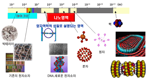 ³ª³ë ±â¼ú(NT; nano-technology)À̶õ ¿øÀÚ³ª ºÐÀÚÀÇ ¼öÁØ¿¡¼ ¹°ÁúµéÀ» Á¶ÀÛÇÏ°í ¸¸µé¾î¼ ÀüÇô »õ·Î¿î ¼ºÁú°ú ±â´ÉÀ» °¡Áø ¼ÒÀÚ³ª ½Ã½ºÅÛÀ» ±¸ÇöÇÏ´Â ±â¼úÀ» ÅëĪÇÑ´Ù. ³ª³ë´Â º»·¡ ±×¸®½º¾î·Î '³ÀïÀÌ'¸¦ ÀǹÌÇϸç, ³ª³ë¹ÌÅÍ (nm; nano-meter)´Â 10-9¹ÌÅÍ, Áï ½Ê¾ïºÐÀÇ 1¹ÌÅÍ¿¡ ÇØ´çµÈ´Ù. ¿øÀÚÀÇ Å©±â°¡ 0.1 ~ 0.5 ³ª³ë¹ÌÅÍÀ̹ǷΠ¼³Ê °³ÀÇ ¿øÀÚ¸¦ ³ª¿ÇÑ Å©±âÀ̸ç, ¿ì¸®ÀÇ ¸ö¼Ó¿¡ ÀÖ´Â ´Ü¹éÁúÀÇ Å©±â(1 ~ 20 ³ª³ë¹ÌÅÍ) Á¤µµÀÌ´Ù. ¶ÇÇÑ ÇöÀçÀÇ ¹ÝµµÃ¼ °øÁ¤ÀÇ ¸¶ÀÌÅ©·Ð ±â¼ú¿¡¼ »ç¿ëµÇ´Â ¸¶ÀÌÅ©·Î¹ÌÅÍ(¥ìm; micro-meter)ÀÇ 1000ºÐÀÇ 1¿¡ ÇØ´çÇÏ´Â Å©±â°¡ ¹Ù·Î ³ª³ë¹ÌÅÍÀÌ´Ù. ÀÌ¿Í °°ÀÌ ³ª³ë ¼¼°è´Â ¿øÀÚ³ª ºÐÀÚÀÇ ¼¼°èÀ̸ç, ±×µ¿¾È ¼º´ÉÀÌ ÁÁÀº Çö¹Ì°æÀ¸·Îµµ º¼ ¼ö ¾ø´Â ¹ÌÁöÀÇ ¿µ¿ªÀ¸·Î¼ °úÇбâ¼úÀÚµéÀÇ ÁÖ¸ñÀ» ¹ÞÁö ¸øÇÏ¿´À¸³ª 1981³â IBMÀÇ ºñ´ÏÈ÷(G. Binnig)¿Í ·Î·¯(H. Rohrer)¿¡ ÀÇÇØ ¹ß¸íµÈ ÁÖ»çÀüÀÚÇö¹Ì°æ(STM; Scanning Tunneling Microscope)À¸·Î ¿øÀÚ³ª ºÐÀÚ¸¦ ´«À¸·Î Á÷Á¢ º¼ ¼ö ÀÖ°í Á¶ÀÛµµ °¡´ÉÇØ Áü¿¡ µû¶ó ºñ·Î¼ ³ª³ë ±â¼úÀÇ ½Ã´ë°¡ ¿¸®°í ÀÖ´Â °ÍÀÌ´Ù.