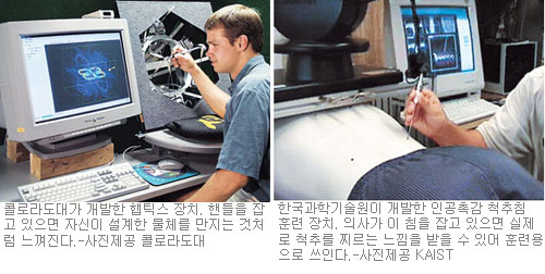 "ÀΰøÃ˰¨ ½Ã´ë ÄÄÇ»ÅÍ·Î ¸¸Áø´Ù" ¼Õ¿¡ ´À³¦ Àü´Þ 'ÇÝÆ½½º ±â¼ú' : µ¿¾ÆÀϺ¸, 2003.7.1, ½Åµ¿È£ ±âÀÚ : 2006³â °æºÎ°í¼Óµµ·Î. ±è¾¾´Â ¿À¸¥ÂÊ ¿· Â÷·Î¿¡¼ ´Ù¸¥ Â÷°¡ µÚ¿¡ ¹Ù¦ ºÙ¾î ´Þ·Á¿À´Âµ¥µµ À̸¦ ¸ð¸£°í Â÷·Î¸¦ ¹Ù²Ù±â ½ÃÀÛÇß´Ù. ±× ¼ø°£ ÀÇÀÚ µî¹ÞÀ̰¡ ±è¾¾ÀÇ ¿À¸¥ÂÊ ¾î±ú¸¦ µÎµå¸°´Ù. ±ô¦ ³î¶õ ±×´Â À绡¸® ÇÚµéÀ» ¿øÀ§Ä¡·Î µ¹·È´Ù. ¸¸ÀÏ ¾î±ú¸¦ µÎµå¸®´Â ¡®ÇÝÆ½ ÀåÄ¡¡¯°¡ ¾ø¾ú´Ù¸é ±è¾¾´Â À̳¯ Å« »ç°í¸¦ ´çÇßÀ»Áöµµ ¸ð¸¥´Ù. ÄÄÇ»ÅͰ¡ ¸ðÅÍ¿Í ±â°è¸¦ ±¸µ¿ÇØ Èû°ú Ã˰¨À» ´À³¢°Ô ÇÏ´Â ÇÝÆ½½º(haptics) ±â¼úÀÌ »õ·Î¿î Á¤º¸±â¼úÇõ¸íÀ» ¿¹°íÇϰí ÀÖ´Ù. ÇÝÆ½½º¶õ ¡®¸¸Áø´Ù¡¯´Â ¶æÀ¸·Î ÀΰøÃ˰¨ ±â¼úÀ» ÀǹÌÇÑ´Ù. »ç¶÷Àº ½Ã°¢À̳ª û°¢º¸´Ù Ã˰¨¿¡ ÈξÀ ºü¸£°Ô ¹ÝÀÀÇÑ´Ù. ÇöÀç ÄÄÇ»ÅÍÀÇ Ãâ·Â ÀåÄ¡´Â ¸ð´ÏÅÍ¿Í ½ºÇÇÄ¿»ÓÀÌÁö¸¸ ¾ÕÀ¸·Î´Â ÀΰøÃ˰¨À» Ãâ·ÂÇÏ´Â ÇÝÆ½ ÀåÄ¡°¡ °ÅÀÇ ¸ðµç ÄÄÇ»ÅÍ¿¡ ´Þ¸± Àü¸ÁÀÌ´Ù. ÇÝÆ½½º°¡ °¡Àå È¿°úÀûÀ¸·Î ¾²À̰í ÀÖ´Â Á¦Ç°Àº °ÔÀÓ¿ë Á¶À̽ºÆ½°ú ½Ã¹Ä·¹ÀÌÅÍÀÌ´Ù. ÃÖ±Ù¿¡´Â ¸¶¿ì½º³ª ÀÚµ¿Â÷¿¡µµ ÇÝÆ½½º ±â¼úÀÌ ¾²À̰í ÀÖ´Ù. ·ÎÁöÅØÀÇ ¾ÆÀÌÇÊ(iFeel) ¸¶¿ì½º´Â ½ºÅ©·Ñ¹Ù³ª ¾ÆÀÌÄÜ À§¿¡ ³õÀ¸¸é ¼Õ¿¡ ´À³¦ÀÌ Àü´ÞµÈ´Ù. BMW ÀÚµ¿Â÷¿¡ ÀåÂøµÈ ¾ÆÀ̵å¶óÀ̺ê(iDrive)´Â ¿îÀü Áß À§ÇèÇÏ°Ô µð½ºÇ÷¹À̸¦ º¸Áö ¾Ê¾Æµµ Á¶ÀÛ¹öưÀÇ Áøµ¿ Â÷ÀÌ·Î ¿Àµð¿À µî ´Ù¾çÇÑ ÀåÄ¡ÀÇ »óŸ¦ ¾Ë ¼ö ÀÖ´Ù. ÇÝÆ½½º ±â¼úÀº Á¤¹ÐÇÑ ¼ö¼ú, ·Îº¿ ¿ø°ÝÁ¦¾î, ¹Ì¼úÀÛǰ Á¶°¢, ÀüÀÚ»ó°Å·¡, ¿£ÅÍÅ×ÀÎ¸ÕÆ®, ¿¬±¸°³¹ß ºÐ¾ß¿¡µµ ¾²À̱⠽ÃÀÛÇϰí ÀÖ´Ù. ÃÖ±Ù ÀüÀÚºÎǰ¿¬±¸¿øÀº ´Ù°üÀý ÇÝÆ½ ÀåÄ¡¸¦ °³¹ßÇß´Ù. ÀÌ ÀåÄ¡ÀÇ ÇÚµéÀ» Àâ°í ¿òÁ÷ÀÌ¸é ½ºÇÁ¸µ¿¡ ¸Å´Þ¸° ¼è±¸½½À» ´øÁ³´Ù ¹Þ¾Ò´Ù ÇÏ´Â ´À³¦À» ½ÇÁ¦Ã³·³ »ý»ýÇÏ°Ô ´À³¥ ¼ö ÀÖ´Ù. ¿¬±¸¿ø Á¤Á߱⠹ڻç´Â ¡°ÇÝÆ½ ÀåÄ¡´Â °¡»ó°ø°£ ȤÀº ¿ø°ÝÁ¶ÀÛ »óȲ¿¡ »ý»ýÇÑ Çö½Ç°¨À» ÁÙ »Ó¸¸ ¾Æ´Ï¶ó ±â°è Á¶ÀÛÀ» Æí¸®ÇÏ°í ¾ÈÀüÇÏ°Ô ÇÑ´Ù¡±°í ¸»Çß´Ù. ÇÝÆ½½º ºÐ¾ßÀÇ ±¹³» °³Ã´ÀÚÀÎ Çѱ¹°úÇбâ¼ú¿ø(KAIST) ±â°è°øÇаú ±Çµ¿¼ö ±³¼ö (Telerobotics & Control lab) ´Â 98³âºÎÅÍ ÇÝÆ½½º ±â¼úÀ» Àû¿ëÇÑ ¸¶¿ì½º, Á¶À̽ºÆ½, ¼ö¼ú¿ë ·Îº¿°ú ¿À¶ô¿ë ÀÚÀü°Å, ÀÚµ¿Â÷, ³¬½Ã ½Ã¹Ä·¹ÀÌÅ͸¦ ÀÕ´Þ¾Æ °³¹ßÇØ ¿À°í ÀÖ´Ù. ±Ç ±³¼ö°¡ Çѱ¹°úÇбâ¼ú¿ø ±³¼ö 6¸í°ú °øµ¿ °³¹ßÇÑ ¿À¶ô¿ë °¡»óÇö½Ç ÀÚÀü°Å ½Ã¹Ä·¹ÀÌÅ͸¦ Ÿ¸é ȸéÀ» º¸¸ç ¾ð´öÀ» ¿À¸¦ ¶§ Æä´ÞÀ» µ¹¸®±â°¡ ¸Å¿ì Èûµé´Ù. ¶Ç º¸µµºí·Ï°ú Ç®¹çÀ» ´Þ¸± ¶§µµ ¶È°°Àº ´À³¦À» ¹Þ´Â´Ù. ½Ã¹Ä·¹ÀÌÅÍÀÇ ³¬½Ë´ë¸¦ ÀâÀ¸¸é ¹Ì³¢¸¦ ¹® ¹°°í±â°¡ ¹°°Å³ª ²ø¾î ¼Õ¸ÀÀ» ´À³¥ ¼ö ÀÖ´Ù. ±Ç ±³¼öÆÀÀº KAIST º¹Áö·Îº¿¼¾ÅÍ, º¥Ã³±â¾÷ ´º·Î½º¿Í ÇÔ²² Àΰø°üÀý À̽ļö¼ú ·Îº¿À» °³¹ßÇÏ´Â µ¥µµ ¼º°øÇØ ¿ÃÇØ ÇϹݱ⿡ ÃæºÏ´ë Á¤Çü¿Ü°ú ¿øÁßÈñ ±³¼ö°¡ ½ÇÁ¦ ¼ö¼ú¿¡ óÀ½ »ç¿ëÇÒ ¿¹Á¤ÀÌ´Ù. Àΰø°üÀýÀ» À̽ÄÇÏ·Á¸é ȯÀÚÀÇ »À¿¡ Á¤È®ÇÏ°Ô ±¸¸ÛÀ» ¶Õ¾î¾ß ÇÑ´Ù. Àǻ簡 ¼ö¼ú¿ë ÇÝÆ½ ·Îº¿ÀÇ ¿ø°ÝÁ¦¾îÀåÄ¡¸¦ ¼ÕÀ¸·Î Á¶ÀÛÇØ ¼ö¼úÀ» ÇÒ °æ¿ì °Çµå·Á¼´Â ¾È µÇ´Â ºÎºÐ¿¡ À̸£·¶À» ¶§ µüµüÇÑ º®¿¡ ºÎµúÈù ´À³¦À» ÁØ´Ù. µû¶ó¼ ¼ö¼úÀÌ ÈξÀ ¾ÈÀüÇϰí Á¤È®ÇØÁø´Ù. ±Ç ±³¼ö´Â ÇÝÆ½ ¸¶¿ì½ºµµ °³¹ßÇß´Ù. ÀÌ ¸¶¿ì½º´Â ¿ÞÂʰú ¿À¸¥ÂÊ¿¡ ¹öưÀÌ ÀÖ´Ù. ¸ð´ÏÅ͸¦ º¸¸é¼ ¼Õ°¡¶ôÀ¸·Î ¸¶¿ì½º ¹öưÀ» ´·¯ ȸé»óÀÇ ¹°°ÇÀ» ¿Å±â¸é ½ÇÁ¦·Î ¹°°ÇÀÌ ¿Å°ÜÁø´Ù. ¶ÇÇÑ ¸¶¿ì½º¸¦ ÅëÇØ ¹°°ÇÀÇ ¸ð¾çÀ» ´À³¥ ¼öµµ ÀÖ°í µüµüÇÑÁö ºÎµå·¯¿îÁö, ¸Å²ô·¯¿îÁö °ÅÄ£Áöµµ ´À³¥ ¼ö ÀÖ´Ù. ±Ç ±³¼ö´Â ¡°¾ÕÀ¸·Î 10³â Âë µÚ¸é ÇÝÆ½ ¸¶¿ì½º°¡ ÀüÀÚ»ó°Å·¡¸¦ ½Ç°¨³ª°Ô ¹Ù²Ü °Í¡±À̶ó¸ç ¡°À̶§°¡ µÇ¸é »çÀ̹ö ¼îÇθô¿¡¼ 3Â÷¿ø ÀÔü ¿µ»óÀ» º¸¸é¼ ÇÝÆ½ ¸¶¿ì½º·Î ÀüÀÚÁ¦Ç°À» ÀÛµ¿ÇÏ¸é¼ ¸ð¾ç°ú ÀçÁúÀ» ´À²¸º¸°í »ì ¼ö ÀÖ°Ô µÉ °Í¡±À̶ó°í ¸»ÇÑ´Ù. ÇöÀçÀÇ ÇÝÆ½½º ±â¼ú ¼öÁØÀº ¹Ì¹¦ÇÑ Ã˰¨À» âÁ¶Çس¾ ¸¸Å ³ôÀº ¼öÁØ¿¡ À̸£Áö´Â ¸øÇßÁö¸¸ °íµµ·Î ¹ß´ÞÇÏ°Ô µÉ °æ¿ì »çÀ̹ö ¼½½ºµµ °¡´ÉÇØÁö°Ô µÈ´Ù.