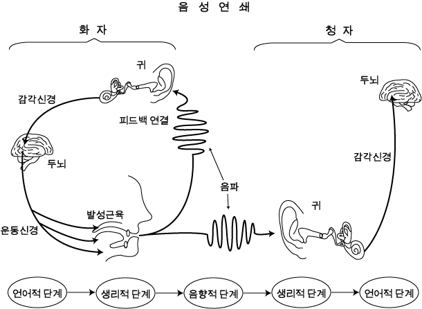 음성발성 (phonation) 은 혀와 입술의 고도로 숙련된 움직임을 필요로 하는 복잡한 활동이다. 더욱이 통합된 근육작용은 음성발성과 의식적으로 연결되어 있지 않는 허파나 위에서도 일어난다. 이 모든 것들이 아주 쉽게 이루어져서 그 과정을 거의 의식하지 못한다. 즉 의식적인 노력없이 행해지는 것이다. 예를들어 운전을 하면서 주변의 경치를 바라보듯이 동시에 여러 가지 활동이 관여할 수 있다. 그러나 음성은 훨씬 복잡한 운동작용이다. 그것은 단어가 대상과 의미에 연결되는 언어 보호에 대한 습득된 지식이 있어야 한다. 또한 구문과 의미에 대한 지식도 연관된다. 뇌의 최고수준에서 간직한 정보와 자발적인 의식활동이 계속 상호작용을 해야한다. 간단히 말해서 음성은 중추신경계 (central nervous system)의 보다 큰 노력이 필요하기 때문에 대부분의 운동작용과는 다르다. 화자의 뇌와 청자의 뇌 사이에 음성이 전달되는 언어연쇄 (speech chain) 의 과정인 것이다. ........... (Peter Denes 1993)