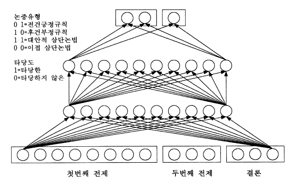 ÀÌ ¿¬°á¸ÁÀº ±¸Ã¼Àû ³íÁõÀÌ Á¦½ÃµÇ¾úÀ» ¶§ Ÿ´çÇÑ ³íÁõÀ¯Çü°ú Ÿ´ç¼º ÆÇ´ÜÀ» ÇнÀÇϵµ·Ï µÇ¾î ÀÖ´Ù. ÈÆ·ÃÀ» ½ÃÇàÇÏ´Â µ¿¾È¿¡ ±× ¿¬°á¸ÁÀº ´õ ¾Æ·¡ ¿ÀÇ ³ëµå¿¡¼ ÃËÁøÇüÅÂÀÇ Çü½ÄÀ¸·Î ¾àÈ£ÈµÈ ³íÁõÀ» °¡Áø´Ù. »óÀ§ ¿ÀÇ ³ëµå¿¡¼ °á°ú·Î ³ªÅ¸³ª´Â Ȱ¼ºÈ ÇüÅ´ ¿¬°á¸ÁÀÌ ±×°ÍÀÇ ¼öÇàÁذŸ¦ ´Þ¼ºÇÒ ¶§±îÁö ÈÄÁøÀû È®»ê¹æ¹ý¿¡ ÀÇÇØ¼ ¼öÁ¤µÇ¾ú´Ù. ±× ´ÙÀ½ ±× ¿¬°á¸ÁÀ» »õ·Î¿î ÀÏ·ÃÀÇ ¶È°°Àº ±âº»Àû À¯ÇüÀÇ ³íÁõµéÀ» ±×°Í¿¡ Á¦½ÃÇÔÀ¸·Î½á °ËÁõµÇ¾ú´Ù. Bechtel °ú Abrahamsen (1991) Àº ¿¬°á¸ÁÀÌ °¢ ¹®Á¦¿¡ ´ëÇÏ¿© 3000 ¹ø¾¿ Á¦½ÃÇÏ´Â ¿¬°á¸Á ÈÆ·Ã ÈÄ¿¡ óÀ½ Á¦½ÃµÈ 192 °³ ¹®Á¦ ¸ðµÎ¸¦ ÇнÀÇß´Ù°í º¸°íÇß´Ù. ÀüÀ̰˻翡¼, ¿¬°á¸ÁÀº »õ·Î¿î ¹®Á¦µéÀÇ 76% ¿Ã¹Ù¸£°Ô ÇØ°áÇß´Ù. Bechtel °ú Abrahamsen ´Â ¶ÇÇÑ ³íÁõ, ³íÁõÀÇ À¯Çü, ³íÁõÀÇ Å¸´ç¼º¿¡ °üÇÑ ¸î°¡Áö »ç½ÇÀ» Åä´ë·Î ºüÁø Á¤º¸¸¦ ä¿ö³Ö´Â ¾à°£ ºñ½ÁÇÑ ¿¬°á¸ÁÀ» ÈÆ·Ã½ÃÄ×´Ù. ¿¹¸¦ µé¾î, ±× ¿¬°á¸ÁÀº ³íÁõ (17a) ÀÇ Ã¹ ¹øÂ° ÀüÀç¿Í °á·Ð, ³íÁõÀÇ À¯Çü, ³íÁõÀÇ Å¸´ç¼º¿¡ ȹµæÇÒ ¼ö ÀÖ¾ú´Ù. Áï, ±× ´ÙÀ½¿¡ ±× ¿¬°á¸ÁÀº ºüÁø µÎ ¹øÂ° ÀüÁ¦¸¦ Àç»ý»êÇØ¾ß¸¸ ÇÑ´Ù. ÈÆ·ÃÀÇ ½ÃÇà¿¡¼, ±× ¿¬°á¸ÁÀº 384 ¹®Á¦ °¢°¢À» 30,000 ¹ø Á¦½ÃÇÑ ÈÄ 98.9% ÀÇ ¿Ã¹Ù¸¥ ¼öÇàÀ» ´Þ¼ºÇß´Ù. ÀüÀÌ ½ÃÇà¿¡¼, ±× ¿¬°á¸ÁÀº ºüÁø ¸íÁ¦¸¦ ä¿ö ³Ö´Â °ÍÀ» Æ÷ÇÔÇÏ´Â ½ÃÇàµéÀÇ 97.6% °¡ Á¤È®Çß´Ù. ±×·¯³ª ³íÁõÀ¯Çü°ú Ÿ´ç¼ºÀ» Æ÷ÇÔÇÏ´Â ½ÃÇà ÁßÀÇ 46.9% ¸¸ÀÌ Á¤È®Çß´Ù.