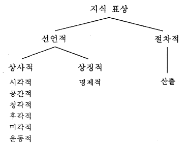 우리가 지식 표상의 분류를 고려하여 논의를 계속할 수 있을 것이다 (비슷한 분류를 위하여, Anderson, 1983 등을 참고하라). <그림 1> 은 분 장의 개념적 틀을 요약한 것이다.