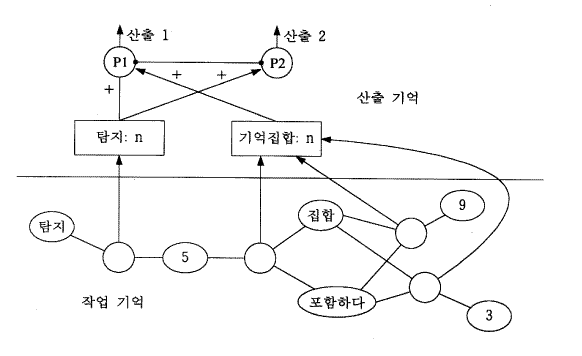 <그림 11> 의 윗 부분은 산출기억을 예시하는데, 여기에는 과제를 완수하기 위하여 필요한 산출과 산출조건을 선언적 기억 내용과 연결시키는 연결망이 있다. ACT 에서 형태 - 짝짓기 연결망 (pattern - matching network) 은 단어 제인 모형에서 McClelland & Rumelhart (1981) 가 사용한 상호작용적 연결망과 유사하다. 각 조건의 산출 (단순화를 위하여 생략된 목표조건을 제외하고) 에는 연결망의 아래 부분에서 대응하는 요소들이 있다. 이런 거점 (terminal) 노드들은 그들에게 짝지워지는 선언적 기억의 요소들을 발견하기 위하여 검사들을 수행한다. 예를 들어, '기억 집합 n' 노드는 기억 집합에서 숫자 'n' 을 찾는다. 이런 노드들은 위의 형태 노드에 그들이 출력한 것을 제공하는데, 이것은 거점 노드 속의 변인들이 똑같은 숫자를 갖는가 여부를 검증하여 준다. P1 은 두 개의 거점 노드로부터 투입을 받고, 탐침단서가 기억 집합에 있는가에 반응한다. 그러나, P2 탐지 단서로부터만 투입을 받고, 단서가 기억 집합에 없는가에 반응한다. 단서의 결핍에 대한 이런 검사는 상호 방해적인 P1 과 P2 간을 연결하고, 단서 노드와 P2 간을 연결시킴으로써 얻을 수 있는 이득을 증가시키는 것이다. 그 단서가 기억 집합 속에 있을 때, 활성화는 양쪽의 거점 노드에서 P1 으로 활성화 되었지만 P2 로 활성화된 것은 단서단어 뿐이었다. P1 에 대한 두 개의 긍정적 투입은 단서에서 P2 로 가는 데서 얻게되는 이득을 상쇄할 뿐 아니라, P1 은 P2 을 억제한다. 탐지단서가 기억 집합에 없을 때는, 탐지 단서만이 P1 과 P2 에 활성화를 보내지만, P2 에 대한 이득이 더 크기 때문에, P2 는 활성화를 더 많이 축적하고 P1 을 억제하는 것 같다.