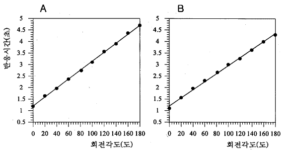 <그림 4> 각도 차의 함수로서 산재된 Shepard 와 Metzler 의 실험에서의 반응 잠재. 그림 A 는 평면회전의 결과를 포함한다. 그림 B 는 깊이 회전의 결과를 포함한다.