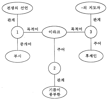 <그림 7> "부시는 사담 후세인이 영도하는 기름이 풍부한 나라인 이라크에 대하여 전쟁을 선언했다." 는 문장에 대한 명제적 연결망 표상.