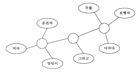 <그림 8> "그 운전자는 보행자의 엉덩이를 치었고, 보행자는 무릎을 다쳤다." 는 문장에 대한 명제적 연결망 표상