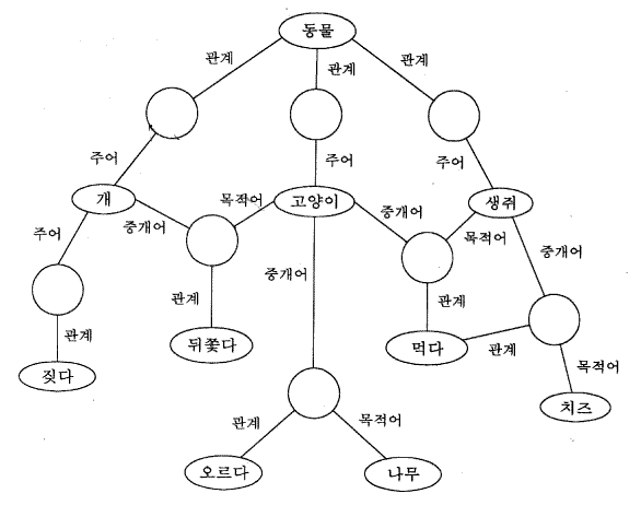 이 예는 '삽화적' 기억 또는 특정 시간과 공간에서 획득된 정보의 기억에 대해 명제적 표상이 적용될 것을 예시했다. 그러나 명제적 표상은 원래 '의미적' 기억 또는 세계에 관한 일반적 지식이 기억에 적용되었다 (예, Collins & Loftus, 1975 등). 그러한 명제적 연결망의 예는 <그림 9> 에 제시되어 있다. 이 연결망은 개, 고양이, 생쥐에 대한 어떤 사람의 일반적 지식의 부분들을 기술하고, "개는 동물이다.", "고양이는 나무에 오른다." 그리고 "생쥐는 치즈를 먹는다." 와 같은 아이디어들을 표상한다.