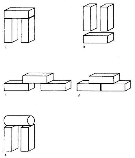Hit-and-near-miss ÇÁ·Î½ÃÁ®¸¦ ÀÌÇØÇϵµ·Ï µ½±â À§ÇØ, ¿©±â¼ ±× ÇÁ·Î½ÃÀúÀÇ ¿äÁ¡ (key point) À» ¼³¸íÇØÁÖ´Â ÀüÅëÀûÀÎ ¿¹¸¦ º¸ÀδÙ. ´©±º°¡¿¡°Ô ºí·Ïµé·Î ±¸¼ºµÈ ¾ÆÄ¡¸¦ ÀνÄÇϵµ·Ï °¡¸£Ä¡°í ÀÖ´Ù°í »ó»óÇØ¾ß ÇÑ´Ù. ¸ÕÀú ±×¸² 2a ¿¡ ÀÖ´Â ¾ÆÄ¡¸¦ ¸¸µé°í, ±×¸®°í³ª¼ ±× »ç¶÷¿¡°Ô À̰ÍÀÌ ¾ÆÄ¡´Ù ¶ó°í ¸»ÇØÁØ´Ù. ´ÙÀ½, À§¿¡ ÀÖ´Â ºí·ÏÀ» ¾ø¾Ö°í ±×¸² 2b ¿¡ ÀÖ´Â °Íó·³ ´Ù¸¥ µÎ ºí·ÏÀÇ ¿·¿¡ ±×°ÍÀ» ³õ´Â´Ù. ±×¸®°í ±× Çлý¿¡°Ô À̰ÍÀº ¾ÆÄ¡°¡ ¾Æ´Ï´Ù ¶ó°í ¾Ë·ÁÁØ´Ù. ÀÌ ´Ü°è´Â, ¾ÆÄ¡´Â ²À´ë±â¿¡ ºí·ÏÀÌ Çϳª ÀÖ¾î¾ß ÇÔÀ» ÀǹÌÇÑ´Ù. ´ÙÀ½ ±×¸² 2c ¿¡ ÀÖ´Â °Í°ú °°Àº ¾ÆÄ¡¸¦ ¸¸µé°í ±× »ç¶÷¿¡°Ô À̰ÍÀÌ ¾ÆÄ¡´Ù ¶ó°í ¸»ÇÑ´Ù. ±×¸®°í³ª¼, ±×¸² 2d ¿¡ ÀÖ´Â ±¸Á¶¸¦ ¸¸µé°í À̰ÍÀº ¾ÆÄ¡°¡ ¾Æ´Ï´Ù¶ó°í ¸»ÇÑ´Ù. À̰ÍÀº Ãø¸éÀÇ ÁöÁÖ°¡ ´ê¾Æ¼´Â ¾ÈµÈ´Ù´Â °ÍÀ» ÀǹÌÇÑ´Ù. ¸¶Áö¸·À¸·Î, ±×¸² 2e ¿¡ ÀÖ´Â ¾ÆÄ¡¸¦ ¸¸µç´Ù. À̰ÍÀº ¸Ç ²À´ë±â¿¡ ºí·Ï ´ë½Å ¿ø ±âµÕÀ» ³õ´Â´Ù. ±×¸®°í À̰͵µ ¿©ÀüÈ÷ ¾ÆÄ¡¶ó´Â °ÍÀ» ³ªÅ¸³½´Ù. ÀÌ Á¡¿¡¼, ÇлýÀº ¾ÆÄ¡¿¡ ´ëÇÏ¿© ´ÙÀ½ÀÇ class ¹¦»ç¸¦ ÇÒ °ÍÀÌ´Ù : ¼·Î ´êÁö ¾Ê´Â µÎ °³ÀÇ ºí·Ï ²À´ë±â¿¡ ºí·ÏÀ̳ª ¿ø±âµÕÀÌ ÀÖ¾î¾ß Çϰí, ÁöÁÖ ºí·ÏµéÀº ¼¼¿öÁ® Àְųª ´¯Çô ÀÖÀ» ¼ö ÀÖ´Ù.