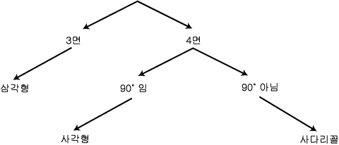 ÈÄÁø ¿¬¼â (backward-chaining) Àü¹®°¡½Ã½ºÅÛÀÌ µ¿ÀÛÇÏ´Â ¹æ¹ýÀ¸·Î µÇµ¹¾Æ°¡ »ý°¢ÇØ º¸ÀÚ. ºÐ¸íÈ÷, ÀÌ·± À¯ÇüÀÇ ½Ã½ºÅÛ¿¡ ´ëÇÑ Áö½ÄÀ» Ç¥ÇöÇÏ´Â °¡Àå È¿À²ÀûÀÎ ¹æ¹ýÀº Æ®¸®ÀÌ´Ù. Àü¹®°¡½Ã½ºÅÛÀÌ Æ®¸®¸¦ ÅëÇØ ÁøÇàÇÒ ¶§, Å« ºÎºÐµé (large sections) À» Àß¶ó³»°í Àû´çÇÑ Áö½ÄÀ» »¡¸® ¹ß°ßÇÑ´Ù. Áö½ÄÀÌ Æ®¸®·Î¼ ¾î¶»°Ô Ç¥ÇöµÉ ¼ö Àִ°¡ ÀÌÇØÇϱâ À§Çؼ, ±×¸² 3 ¿¡ º¸¿©Áø, »ï°¢Çü, »ç°¢Çü, »ç´Ù¸®²Ã¿¡ ´ëÇÑ Á¤º¸¸¦ ÀúÀåÇϱâ À§ÇÏ¿© »ç¿ëµÈ Æ®¸®¸¦ »ý°¢ÇØ º¸ÀÚ. ±×¸²¿¡¼ º¸¿©ÁÖµíÀÌ, ÀÌ Áö½Ä Æ®¸®¸¦ »ç¿ëÇÏ´Â Àü¹®°¡½Ã½ºÅÛÀº Æ®¸®¸¦ ÅëÇØ À̵¿ÇÔ¿¡ µû¶ó »ç¿ëÀÚ¿¡°Ô Ç×»ó ÀûÀýÇÑ Áú¹®À» ÇÒ °ÍÀÌ´Ù.