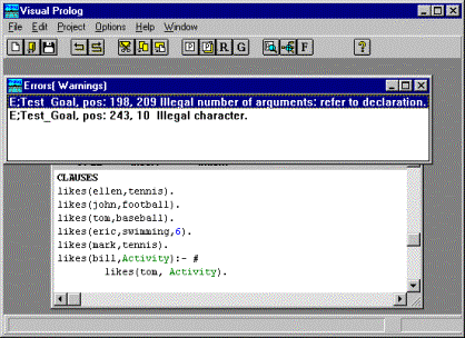 If you, like all programmers do, happen to make some errors in your program, the Visual Prolog system will display an error window, which contains a list of errors. You can double click on one of these errors to come to the position of the error in the source text.