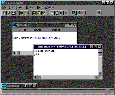 (The Visual Prolog system treats the GOAL as a program which it compiles, links and generates a Windows executable from. It uses the EASYWIN strategy, which is described in the VDE manual.).