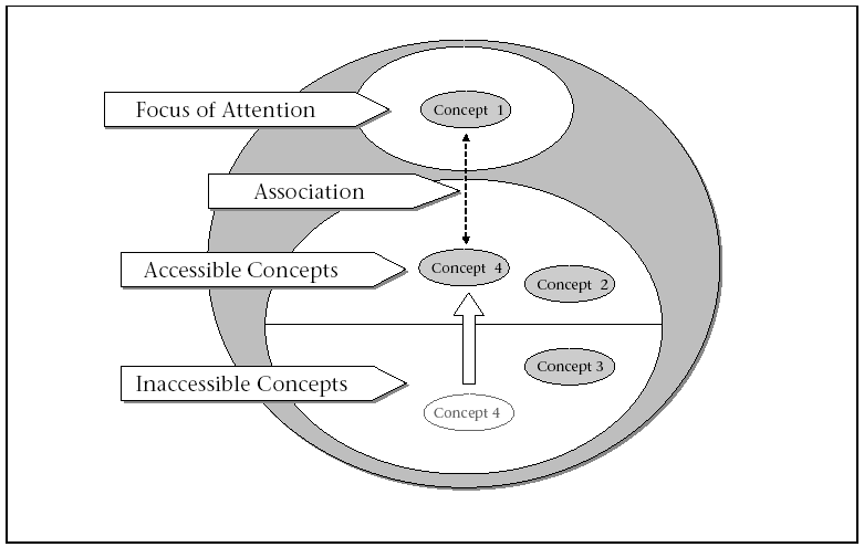 ¸¶À½ (Mind) Àû¾îµµ µÎ°³ÀÇ ºÎºÐÀ¸·Î ±¸¼ºµÈ´Ù. Áï ÁÖÀÇÁýÁß ¿µ¿ª (focus attention) °ú ±â¾ï (memory) ÀÌ´Ù. °³³ä (Concept) µéÀº ¸¶À½¼Ó¿¡ ÀÖÀ¸¸ç, ÁÖÀÇÁýÁß (Attention) ¿µ¿ª¿¡ ÀÖÀ»¼öµµ ÀÖ°í ±â¾ï (Memory) ¼Ó¿¡ ÀÖÀ»¼öµµ ÀÖ´Ù. ÇϳªÀÇ °³³ä (concept) Àº ¶Ç´Ù¸¥ °³³äÀ» ºÒ·¯¿Ã¼ö ÀÖ´Ù. À̰ÍÀº ÁÖÀÇÁýÁß ¿µ¿ª (focus of attention) ¼Ó¿¡ Àִ ù¹øÂ° °³³ä (concept 1) ÀÌ Áß¿äÇÑ ¿ªÇÒÀ» ÇÏ´Â µ¿ÀÛ°ú ¿¬°üµÇ¾î µÎ¹øÂ° °³³ä (concept 4) À» ±â¾ï (memory) ¿µ¿ªÀ¸·ÎºÎÅÍ ÁÖÀÇÁýÁß ¿µ¿ªÀ¸·Î ºÒ·¯¿À±â ¶§¹®¿¡ ¹ß»ýÇÑ´Ù. µÎ°³ÀÇ °³³äÀº ¿ÏÀüÈ÷ ÀÓÀÇÀÇ (random) ¿øÀÎÀ¸·Î ÀÎÇØ ¿¬°üÁö¾î Áú¼ö ÀÖ´Ù. ´©±¸´Â ÀÏÇг⶧ ¼±»ý´ÔÀ» ±×³É »¡°£»ö°ú ¿¬°üÁöÀ»¼öµµ ÀÖ´Ù. °³³äµé °£ÀÇ ¿¬»óÀº ÀÓ½ÃÀÇ ÀÓ±âÀÀº¯ (temporary and ad hoc basis) ¿¡ ±âÃÊÇØ¼ ¼º¸³µÉ¼ö ÀÖ´Ù. ¿¹¸¦µé¸é ¼Õ°¡¶ô ÁÖÀ§ÀÇ ½ÇÀ» ¾î¶²³¯ ÁýÀ¸·Î °¡´Ù°¡ ¼öÆÛ¿¡¼ Ä¡¾àÀ» »ç´Â Çൿ°ú ¿¬°üÁöÀ»¼öµµ ÀÖ´Ù. ¿ì¸®ÀÇ ±â¾ï¼Ó¿¡¼ ¿¬»ó¿¡ ´ëÇØ ±íÀÌ ºÐ¼®ÇÏ´Â °ÍÀÌ ¾Æ´Ï¶ó ¿¬°üµÇ´Â °³³äÀÇ ¿øÀÎ ¼ø¼ (causal consequence) ¿Í °ü·ÃµÈ °ÍÀÌ´Ù. ÃÖ±Ù À̷п¡ µû¸£¸é ¿¬»óÀº ¿¡ÀÌÀüÆ®¿¡ ÀÇÁ¸ÇÏÁö ½Ã°£¿¡ ÀÇÁ¸ÇÏÁö´Â ¾Ê´Â´Ù´Â °ÍÀÌ´Ù. ±â¾ï¼ÓÀÇ ¿¬»ó (association) ¿¡ ´ëÇÑ ±âº»ÀûÀÎ »ç½ÇÀº ¾î¶²°ÍÀ» ±â¾ïÇÑ´Ù¸é ±×°ÍÀº ±×°Í°ú ¿¬°üµÈ °³³äÀÇ Á¢±Ù°¡´É¼º (accessibility) ¸¦ ³ôÀϰÍÀ̶ó´Â °ÍÀÌ´Ù. ±×·³À¸·Î½á ±â¾ï¼Ó¿¡¼ Á¢±ÙºÒ°¡´ÉÇÑ °³³ä (inaccessible concept) ÀÌ ±â¾ï¿ªÄ¡ (memory threshold) ¸¦ ¶Ù¾î³Ñ¾î Á¢±Ù°¡´ÉÇÑ °³³ä (accessible concept) À¸·Î À̵¿ÇÏ°í ±×°ÍÀº ´Ù½Ã ÁÖÀÇÁýÁß ¿µ¿ªÀ¸·Î À̵¿ÇÏ¿© »ç°í (Thinking) ¿¡ Ȱ¿ëµÇ°Ô µÈ´Ù. ....... (Andrew S. Gordon 2004)